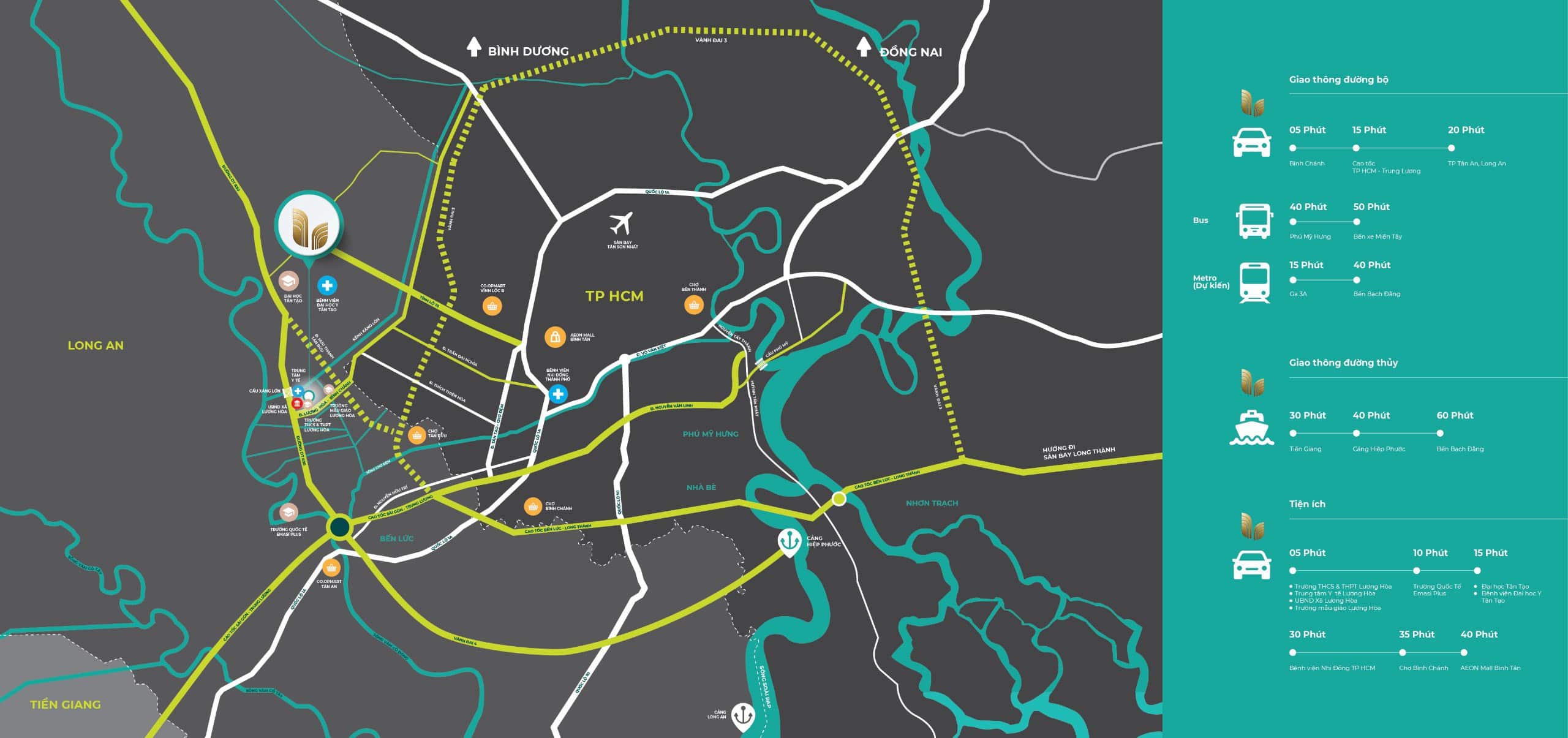 • Ngoài ra còn có thể di chuyển đến rất nhiều địa điểm trung tâm của TPHCM, Long An thông qua các tuyến đường huyết mạch.